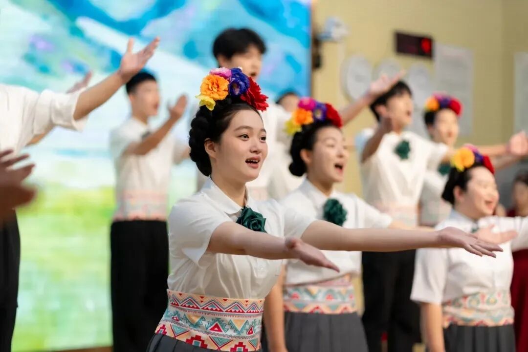 《Rosas Pandan》是菲律宾宿务经典民歌,以人声构建和声,描绘乡村风光与少女情愫。同学们凭借精准音准、纯净音色演绎歌曲内核,妆造融入弗里达风格——手工头饰、领花与腰封色彩浓烈,既呼应弗里达的民族美学追求,也契合歌曲文化背景:菲律宾曾受西班牙殖民,其文化融入西班牙基因,而弗里达造型正是西语文化与民族风情的融合,让表演更具感染力。
