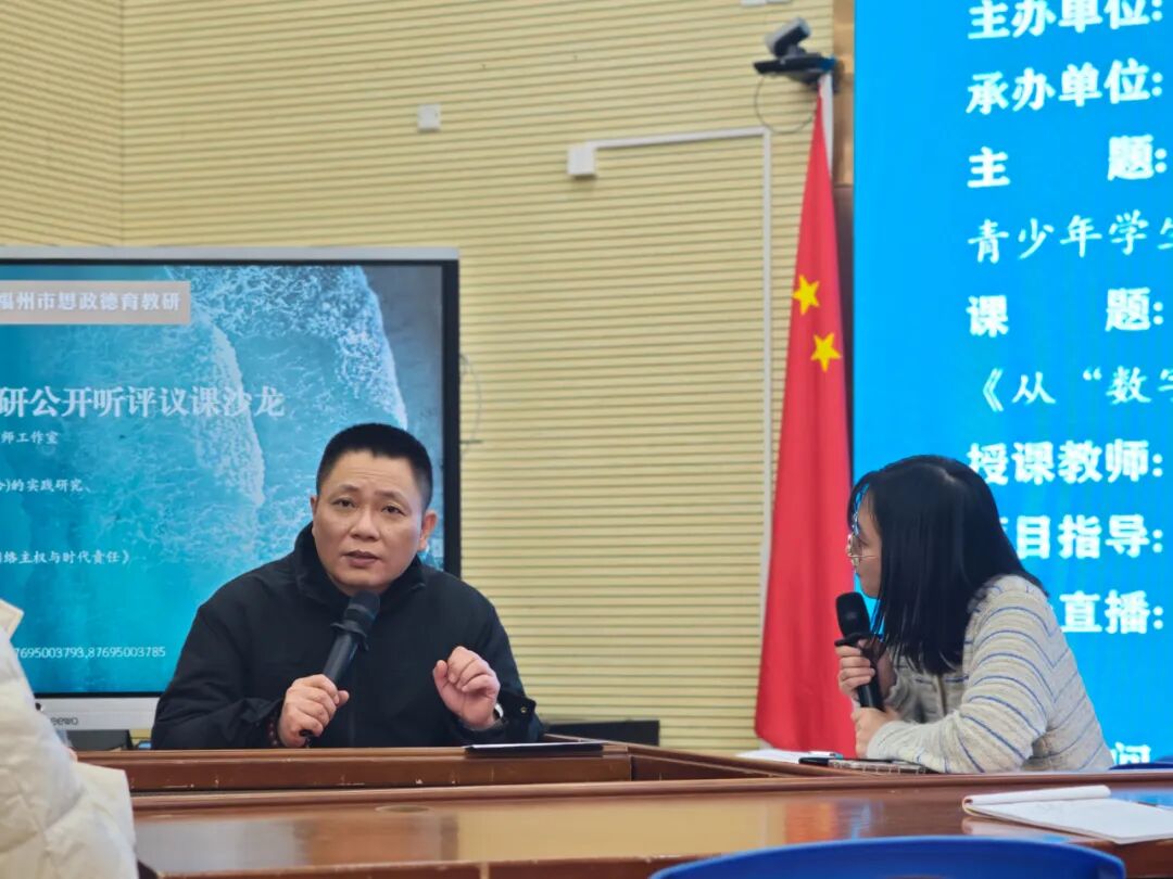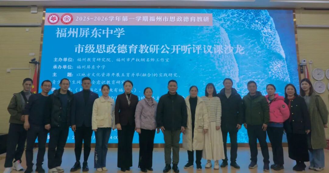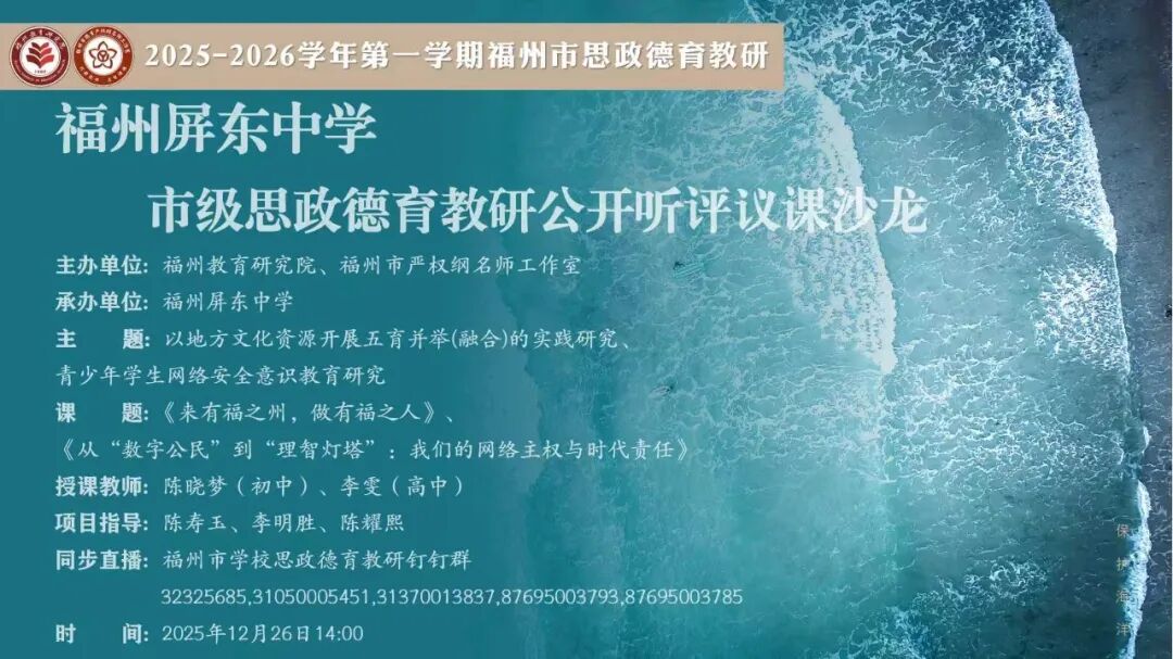 深化思政德育教学改革,搭建优质教研交流平台,推动思政课内涵式发展,2025年12月26日,由福州教育研究院、福州市严权纲名师工作室主办,福州屏东中学承办的市级思政德育教研活动成功举行。福州屏东中学林水啸书记、郑其瑞校长、福州教育研究院德育中心严权纲主任、福州象峰中学陈丽清校长、福州屏东中学叶辉副校长、教育学院第二附属中学林明芳副校长及福州市德育研训中心组成员、福州市德育严权纲名师工作室成员李明胜老师、陈耀熙老师莅临指导,各校德育骨干教师齐聚一堂,共研思政育人新路径。活动通过福州市学校思政德育教研钉钉群同步直播。
