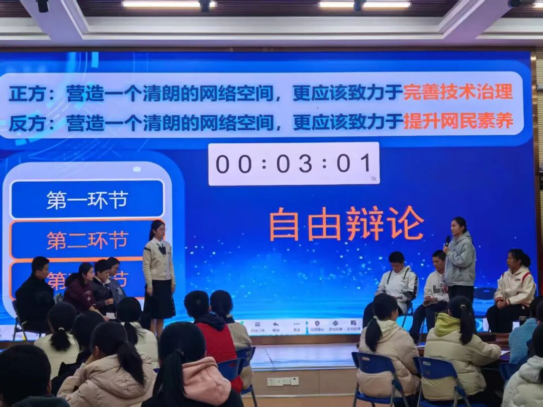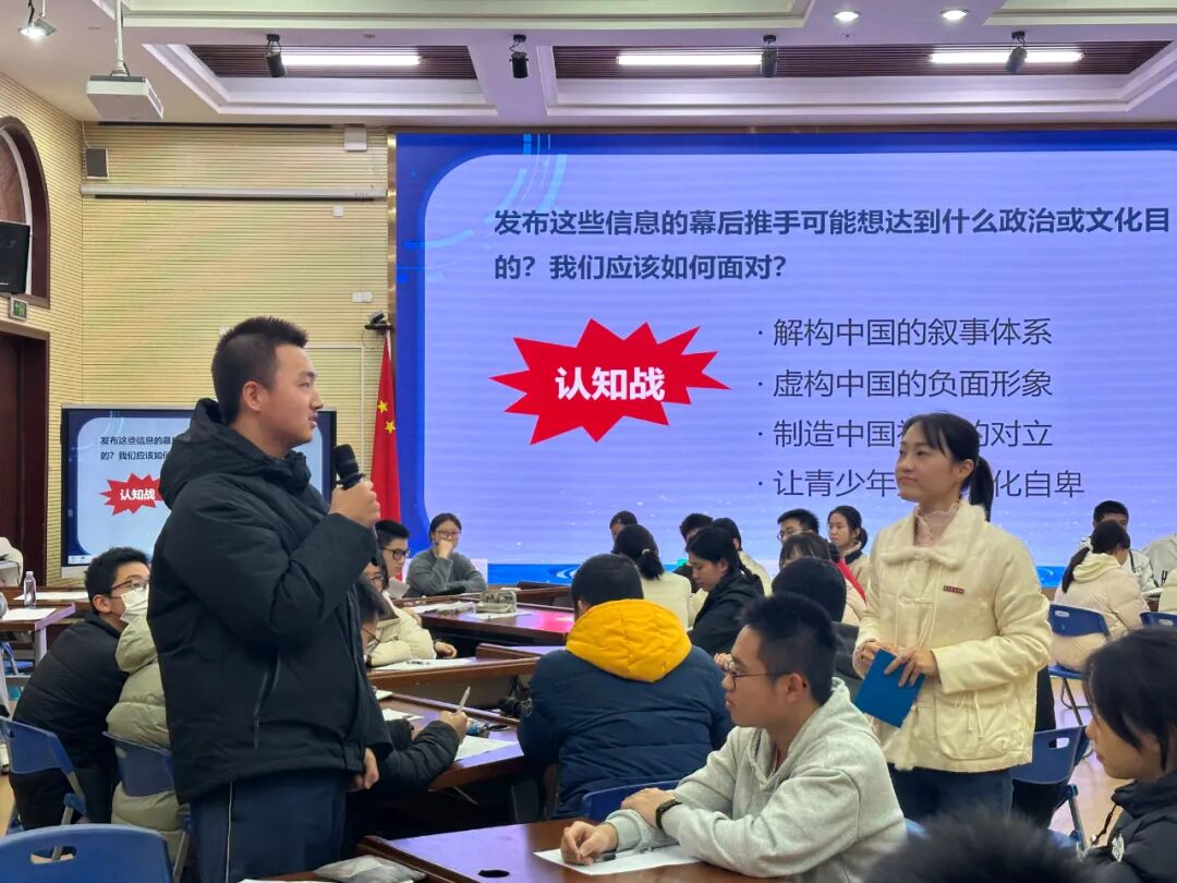 课堂上,李老师通过AI视频导入、学生短剧展演、案例工坊剖析、辩论赛思辨等多元环节层层推进,还引入“认知战”案例组织小组研讨,最后依托小组智慧共同构建“理智灯塔”模型。课程尾声,播放习近平总书记对网络安全与青年责任的寄语视频,将课堂立意从个人防护升维至国家网络主权捍卫,让网络安全的责任意识深深扎根在每位同学心中。