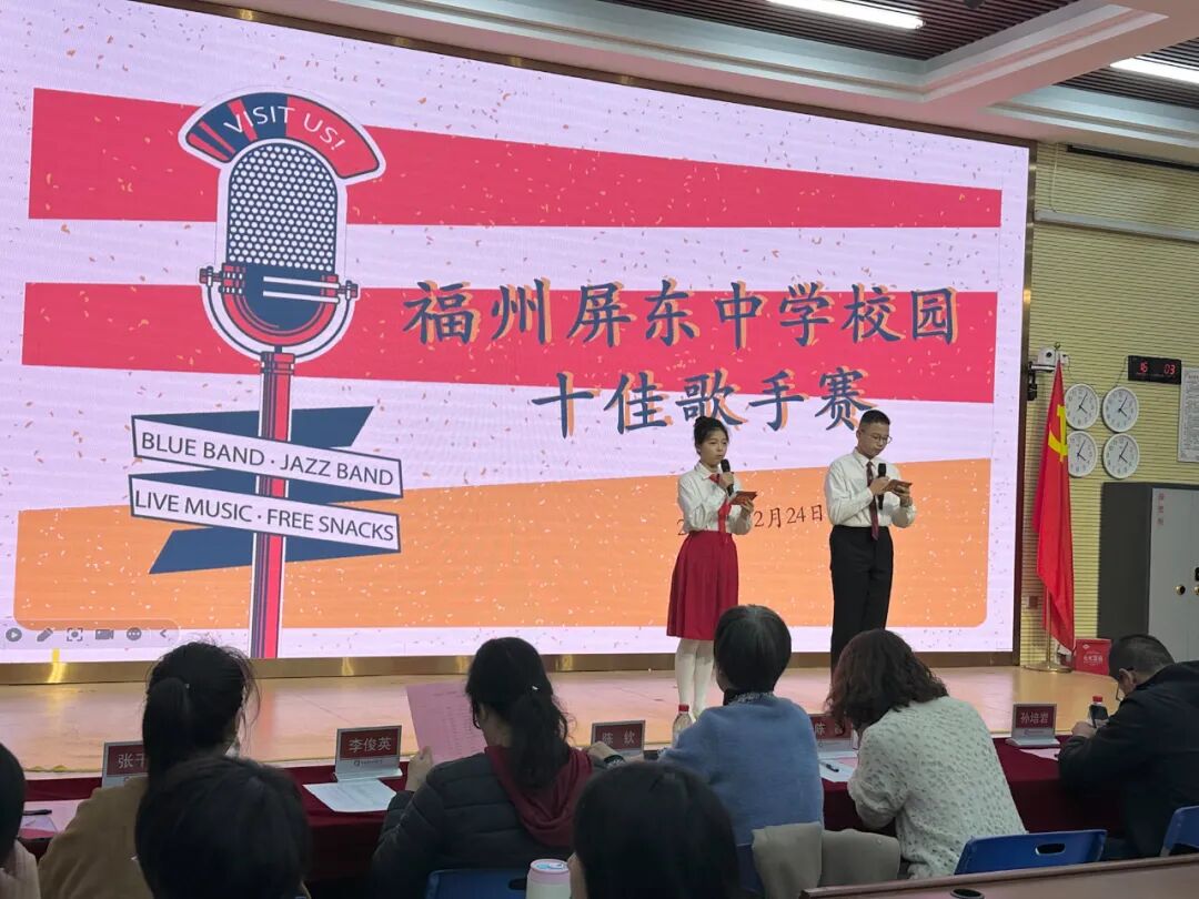 歌声点燃青春激情,音符奏响华丽乐章,福州屏东中学校园十佳歌手大赛在全校师生的热切期盼中完美收官。12月24日下午,“以声逐梦,唱响青春”校园十佳歌手大赛决赛于道德讲堂隆重举行。叶辉副校长、德育处黄宗祥主任、教务处孙培岩副主任、团委书记程丹旭老师以及艺术组老师莅临大赛现场。三十位怀揣音乐梦想的少年齐聚舞台,用嘹亮的歌声与真挚的情感,为初冬的校园勾勒出一幅充满青春活力的动人画卷。本次大赛由初二24班黄晟卓同学和初二19班吴她同学担任主持。