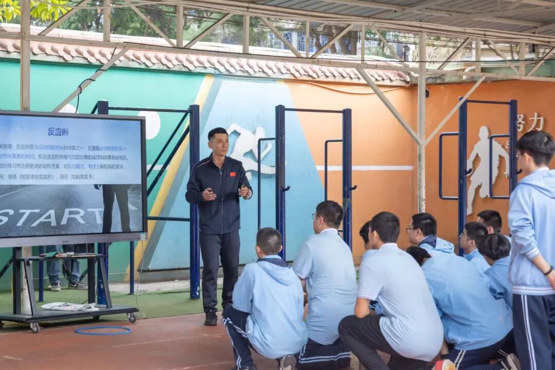 本节课以“感知反应原理—AI精准测评—情境化训练—补偿性提升—多元评价”为主线,精准破解了高三学生体能练习枯燥、个体差异难兼顾的教学痛点。课堂伊始,吴老师通过“警报响起”热身跑与动态拉伸组合,快速激活学生身体机能,随后借助教学一体机讲解反应时原理及在运动与应急场景中的作用,结合动作视频建立正确动作表象。